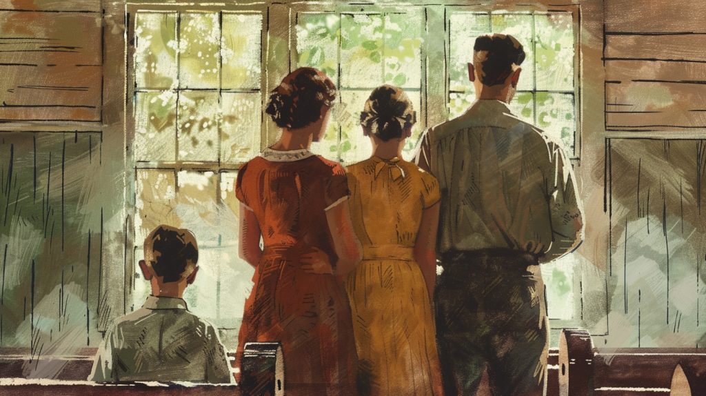 Darlene had cardboard in her shoes to fill the holes. The cardboard came apart, and her feet got wet, but we sat in church proudly, despite how we looked. I heard some teenagers talking about the Smith girls having on their old dresses. I looked at them in their new clothes, and I felt so rich.